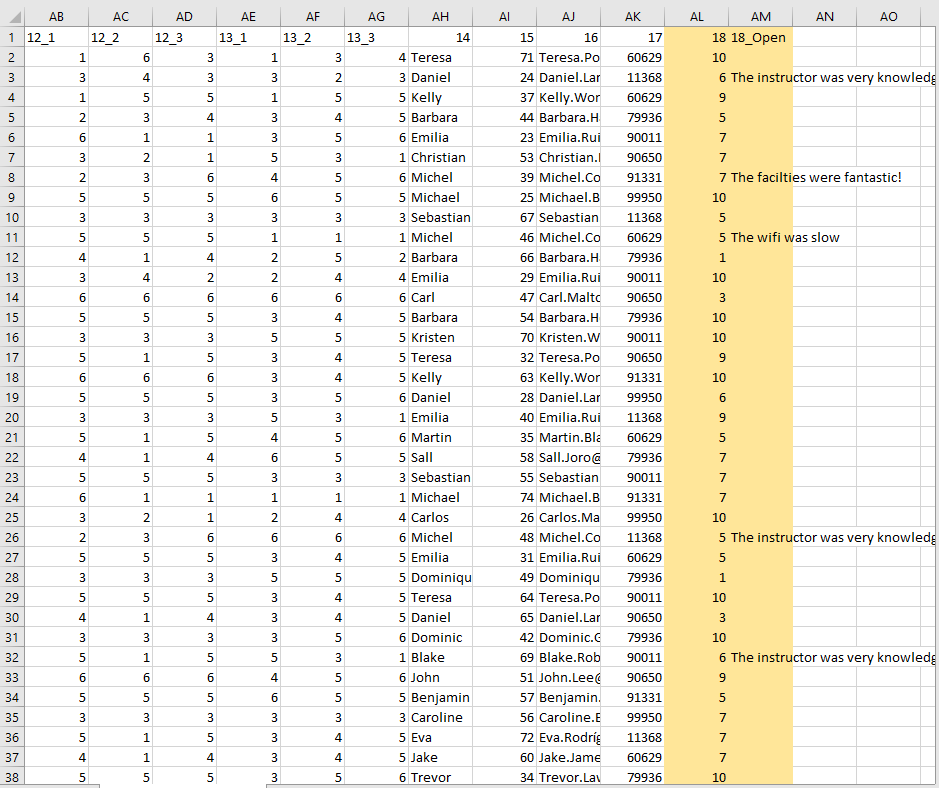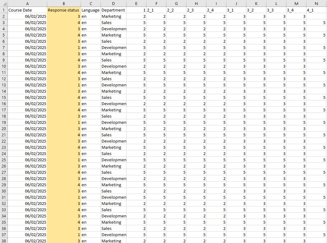 - Each respondent's row must include the selected scale number. For example, if the question has a 1-5 scale, the number "2" means that the respondent selected 2 in the 5-point scale.