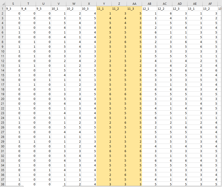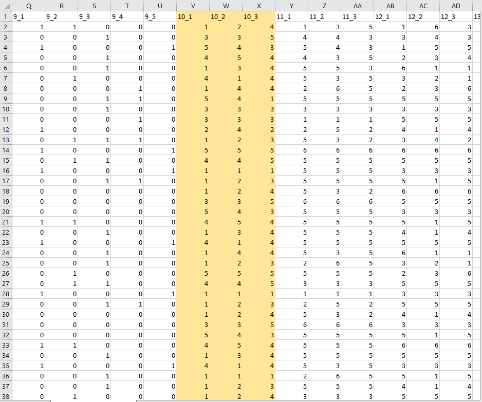 - Each column and row must include the label number of the response option they selected. For example, the number "1" means that the respondent selected the first response option in the question.