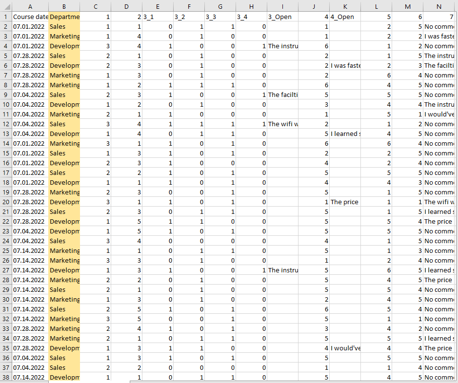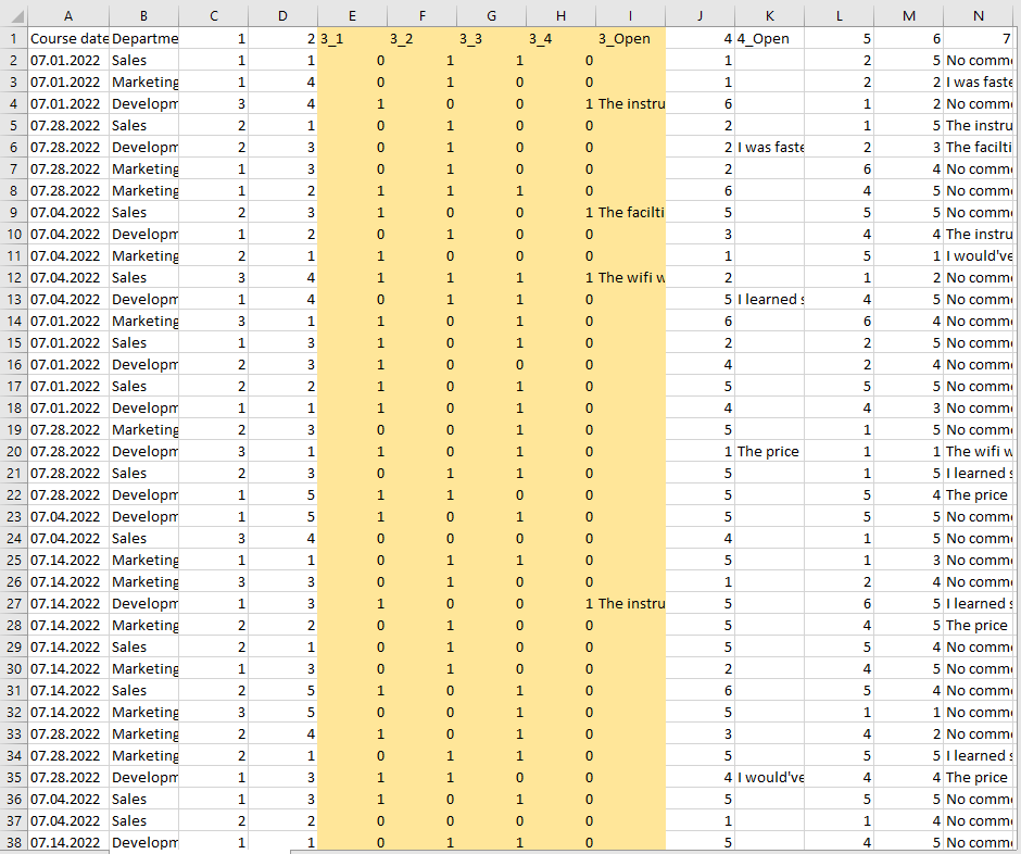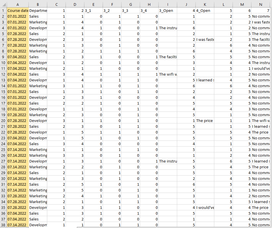 - Each column and row must include the value of the selected scale number. For example, if the question has a 1-5 scale, the number "2" means that the respondent selected 2 in the 5-point scale.